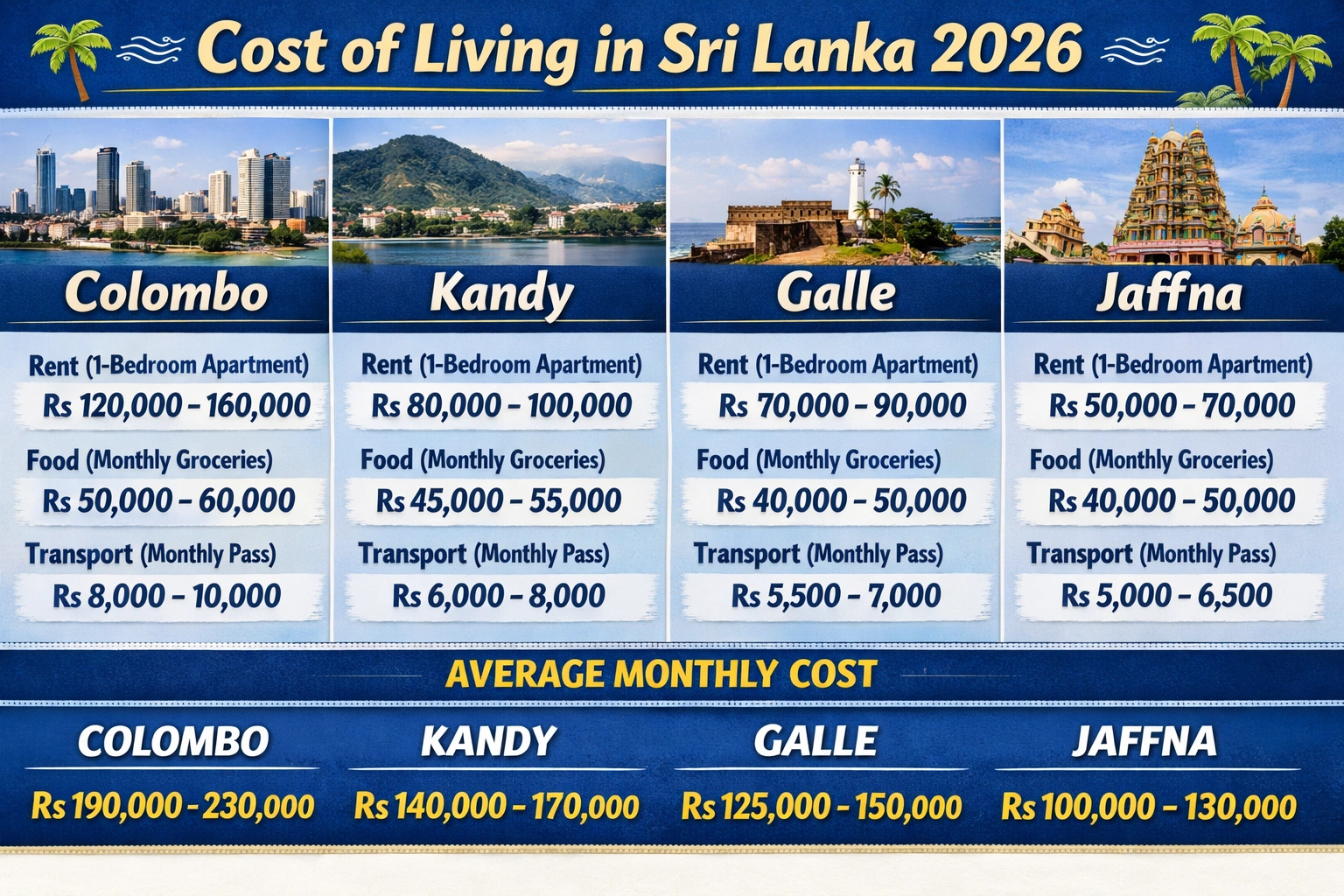 Compared with Colombo, Kandy, and Galle, Jaffna is generally the most affordable major city, but you trade off infrastructure quality, job depth, and some lifestyle conveniences. It suits minimalist expats, remote workers, and retirees more than corporate professionals seeking big-city amenities.