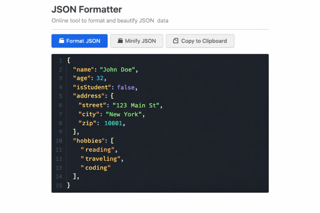 The JSON Formatter transforms messy, minified JSON into properly indented, readable format. It also validates JSON syntax, highlighting errors when the structure is invalid.