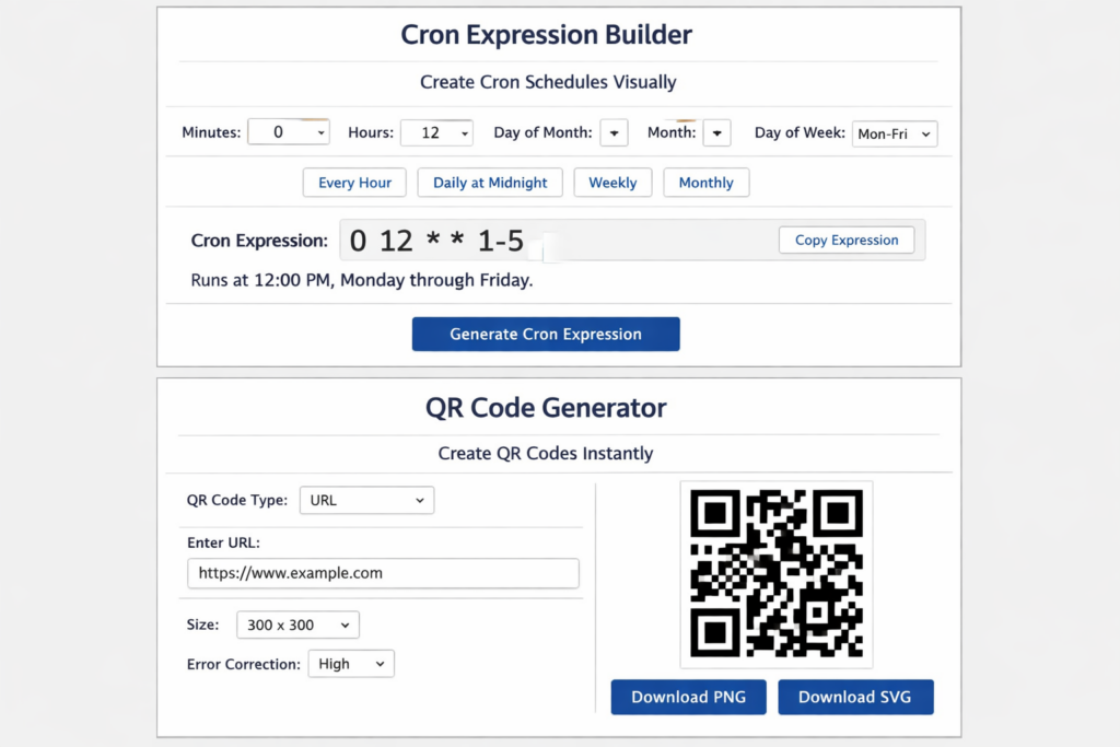 The Cron Expression Builder constructs cron expressions through a visual interface. Instead of memorizing cron syntax, select times and intervals from dropdown menus.