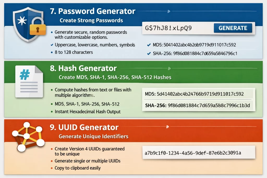 Hashes verify file integrity – if the hash matches, the file hasn’t changed. Password storage uses hashes to protect credentials. Data deduplication identifies identical content through matching hashes. The generator handles quick verification and testing without running terminal commands.