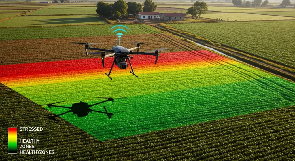 For larger-scale detection, AI analyzes satellite imagery and drone footage captured at regular intervals. Multispectral satellite cameras capture data beyond visible light—including infrared wavelengths—that reveal crop stress before visual symptoms appear.