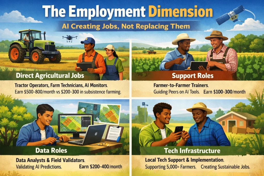 Tractor operators, farm technicians, and AI system monitors emerge as new roles. Hello Tractor created 6,000+ jobs. Each of these jobs pays better than subsistence farming. A tractor operator trained via the platform might earn $500-800 monthly compared to $200-300 from farming.