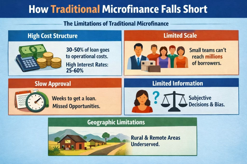 High Cost Structure: Traditional microfinance lending involves human relationship-building, field agents visiting borrowers, manual documentation, and slower approval processes. These costs are expensive. MFIs spend 30-50% of loan amount on operating costs. For a $100 microloan, $30-50 goes to operational costs. That means the borrower pays much higher interest rates (25-60% annually) to cover costs.
