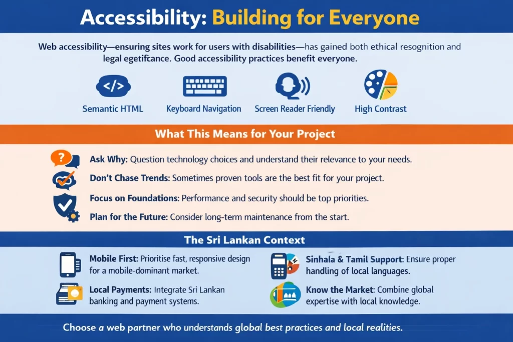 Local factors influence technology choices. Internet speeds, while improving, still vary significantly across Sri Lanka. Mobile dominates access. These realities should shape development decisions—prioritising performance, ensuring mobile excellence, and accounting for variable connection quality.