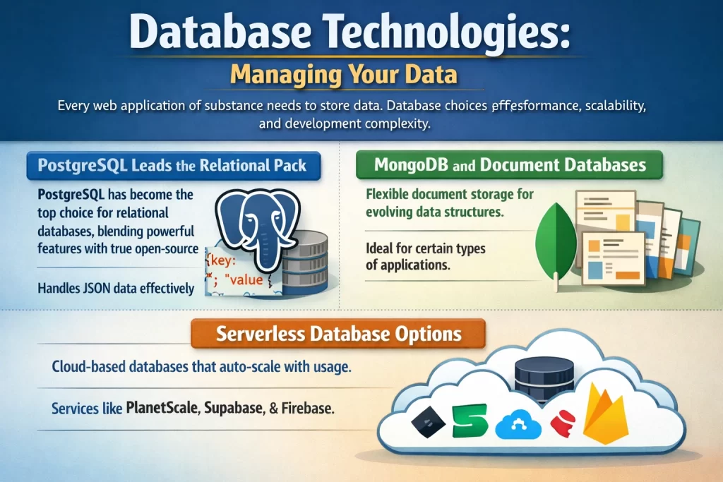 Every web application of substance needs to store data. Database choices affect performance, scalability, and development complexity.