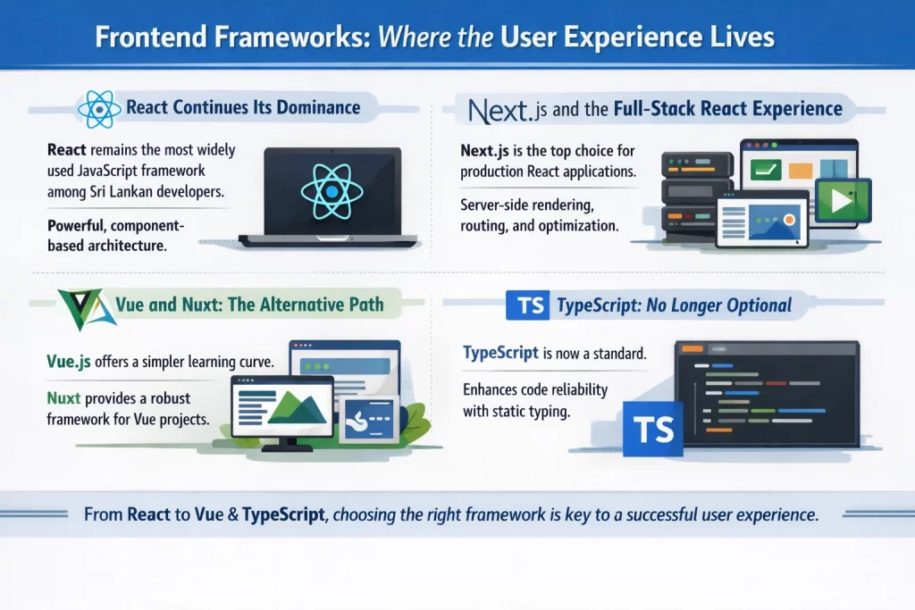 React, developed by Meta, remains the most widely used JavaScript framework among Sri Lankan developers. Its component-based architecture allows developers to build complex interfaces from reusable pieces, improving both development efficiency and code maintainability.