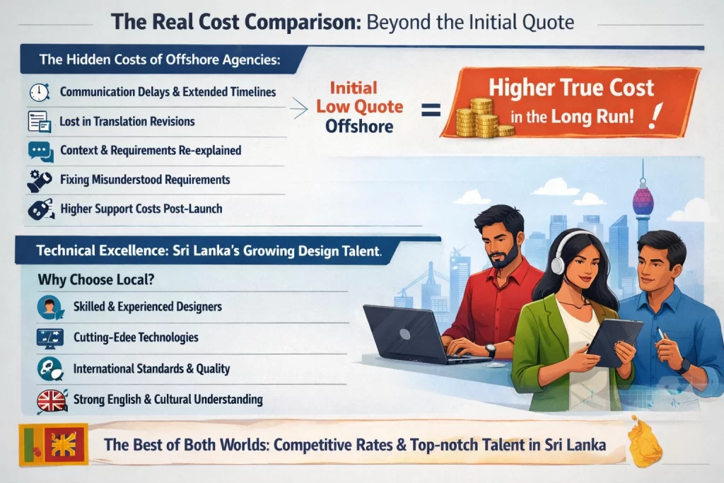 Meanwhile, web design in Sri Lanka has become increasingly competitive. Local designers offer rates that are already attractive compared to Western markets, while providing all the advantages of local partnership. The price gap between local and offshore options is often much smaller than people assume—and sometimes doesn’t exist at all once you factor in the true total cost.